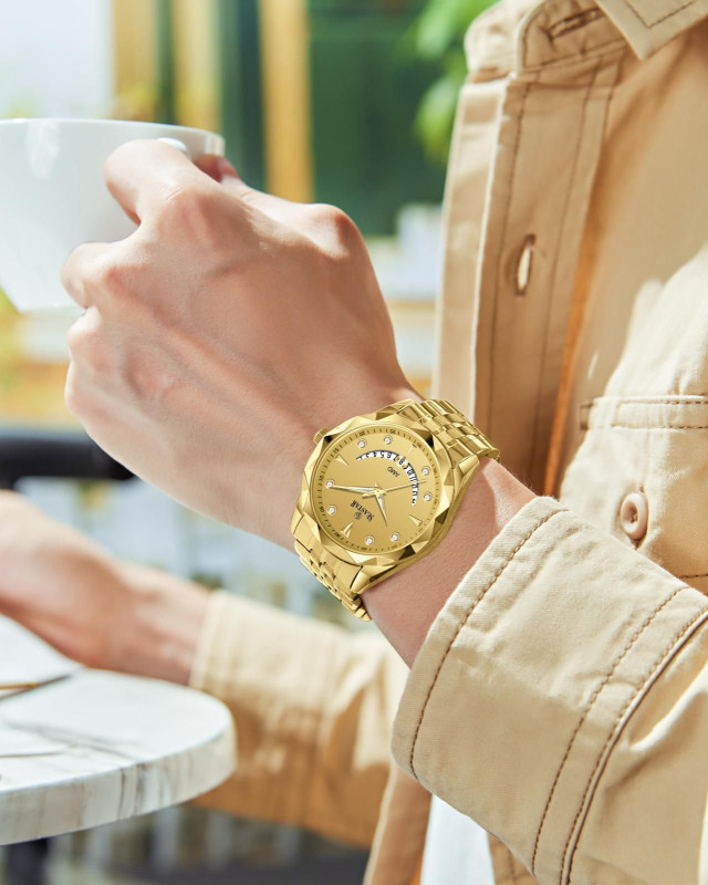 The two-tone stainless steel strap (gold and silver) enhances durability while providing a luxurious finish. The uniquely designed bezel adds a bold touch, while the built-in date display ensures everyday practicality. Powered by reliable quartz movement, this watch offers accurate timekeeping and long-lasting performance.